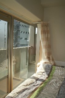 南側バルコニーに面していて、窓じゃないところの壁も全部はめごろしのガラスなのです。 んで、こういう風に角があるってこと。見にくいですが、わかるかなぁ。右側が外から見た画。 手前のリビングもはめごろしのガラス壁です。