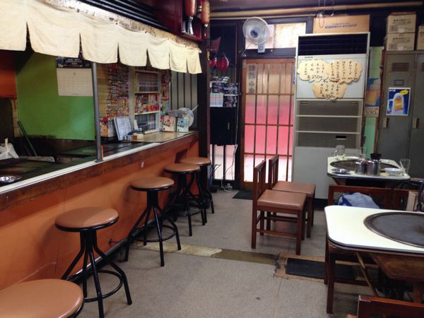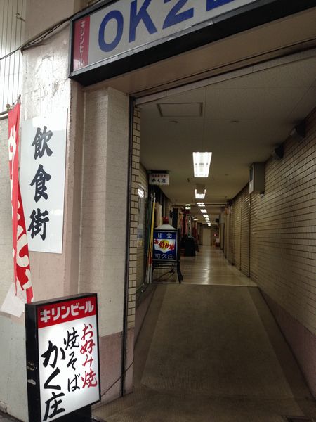 | この方向から車で到着。福島駅高架下OK2番街にある「かく庄」。左手にはコイン駐車場あり。 |