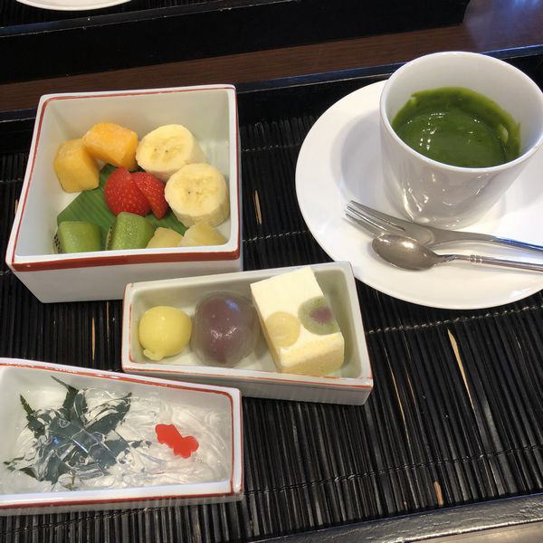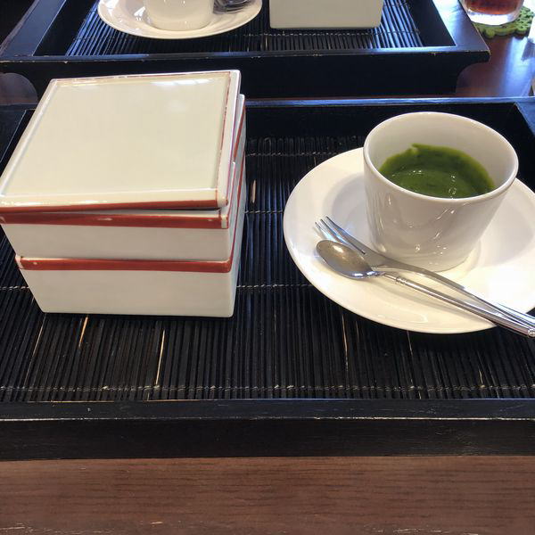 フタを開けるところからワクワクです。真ん中のお皿の右の端にあるケーキが「さがの路」。レアチーズケーキの中によもぎと柚子の大福餅が閉じ込められてるの、素敵です。買って帰りたい。