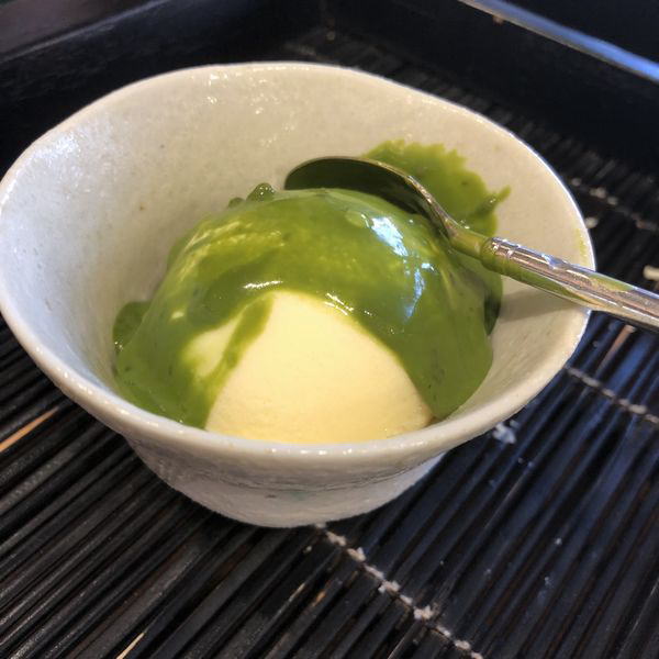 仕上げにアイス。抹茶チョコソースの残りをたっぷりかけて。 |