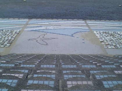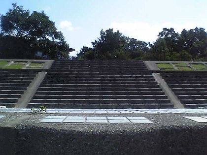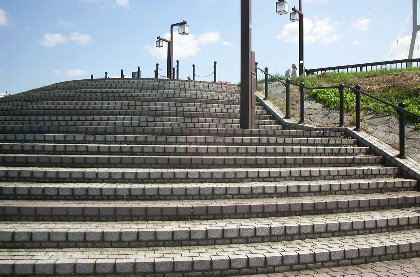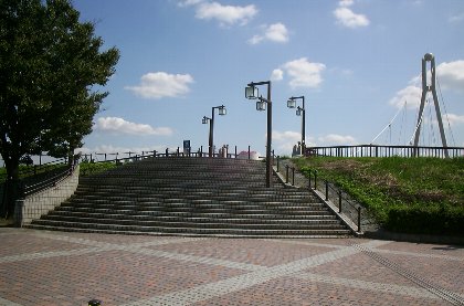 | 次郎くんが自主トレ中、元にぃがここに来ました。この階段、段差が結構きつくてびっくり。これを何回も往復して偉いわ〜。右は川のほうから見上げた感じ。 | |