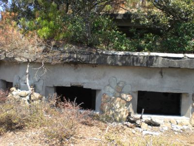 | 旧海軍聴音所跡 「何だ?何だ?」 | スタッフの背中を借りて上がった所。スタッフは左の木を使って自力で 上がりました。「オレが出来ない奴みたいじゃんか」 私たちは左に曲がった所の木を使って上がりました。軍手持って行って良かった。 |