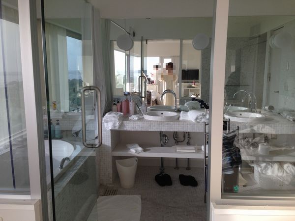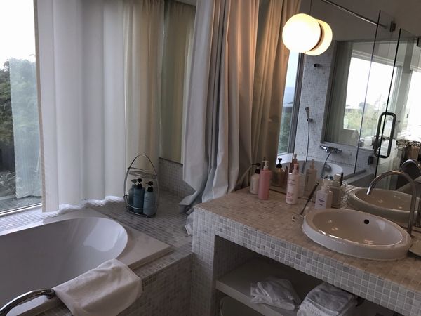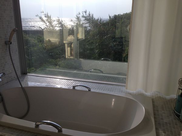 横に長く端から端までオーシャンビュー。 洗面台は2つ並んでおり、お風呂もオーシャンビュー。 このお風呂に中居さんも入ったに違いないです。 中居さんと同じお風呂にまた入っちゃった。向陽閣に続き2回目(笑)。 |