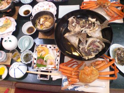 | ちなみに、私たちは国賀荘に泊まりました。 またすごい量のおかずが。全然食べきれず、それでも胃が三角状に前に飛び出るぐらい食いましたとも。 あとからお酒を一滴も飲めず、テレビもろくに見てられず、寝るのみ(笑)。 |