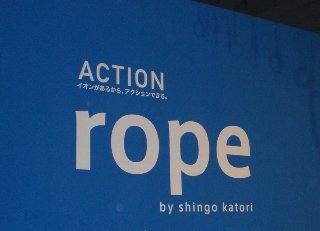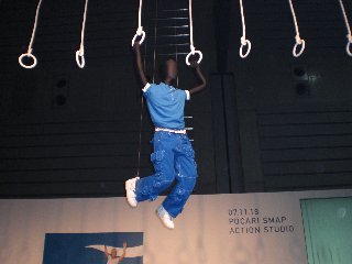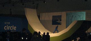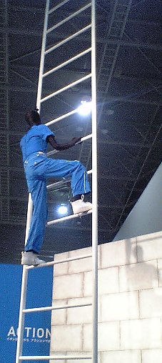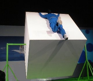 | 会場は、大きなスペースを半分に仕切って、手前半分が第1部のエリア。 ずらーっと周囲にCMセットが。時計回りに梯子、サークル、砂、キューブ、ロープ。 梯子若干短め、サークルは半円より小さめ、砂の坂も小さめ。キューブとロープは本物の大きさかな。 それぞれにCMと同じように衣装を着た人がチャレンジ中。(ただし黒いマネキン) それぞれのコーナーにCMコンテ展示と、大型画面でCMが流れている。 |
