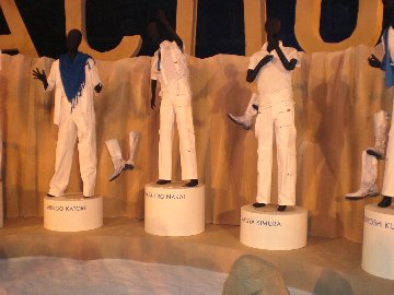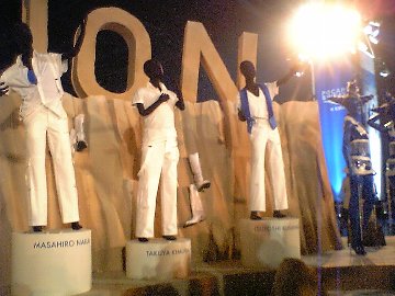 会場中央には、砂の惑星編の4分の1模型。 砂の惑星編の衣装が、左からCMと同じく、吾郎、慎吾、中居、木村、剛で、左右に青いおねえさんたちが並ぶ。 近くからしか撮れなくて、どうしても5人一緒に入らず。 そこで、2つに分けて撮影したつもりが、あれれれれ? 左端の吾郎さまが撮れてなぃー!ごめんなさい!! |
