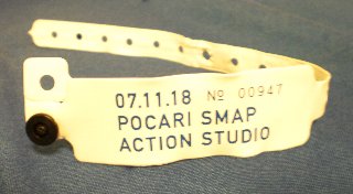 | 入場13:00 12時半頃着いたけど、どうなることかと思うぐらい人が並んでいた。5000人ってことはなく、8000人くらいいたのでは(笑)。堂々と「関係者入口何番〜何番」っていう大きな看板があり、関係者にそんなに大きな番号がついてるって何事ぉ?って思う。 入口で渡されたビニール袋の中身は、直系の大きなぷちぷちのシート(A4サイズぐらい。コンクリートの地べたに座るためのクッション。でもこの大きさじゃあお尻がはみ出るー。)、ポカリ引き換え券、お土産引き換え券、リストバンド(右写真)。これには、最後に行った抽選用の番号が書いてある。このホックは1回止めるとはずせない代物。私は穴のほうをぐりぐり広げてはずしたが、バンドを切った人もいたみたい。(ちなみに、夕方からの2回目のイベントではリストバンドは青地に白字だったとか。) |